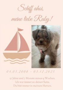 Nach 17 Jahren und 7 Monaten auf vier kleinen Hundepfoten, die kleine Hundenase im Wind, die Löckchen geflochten und die Leckerchen immer in Blick, bleibt dein kleines Körbchen nun leer. Über diese lange Zeit wurde unsere Verbindung irrational tief und fest.